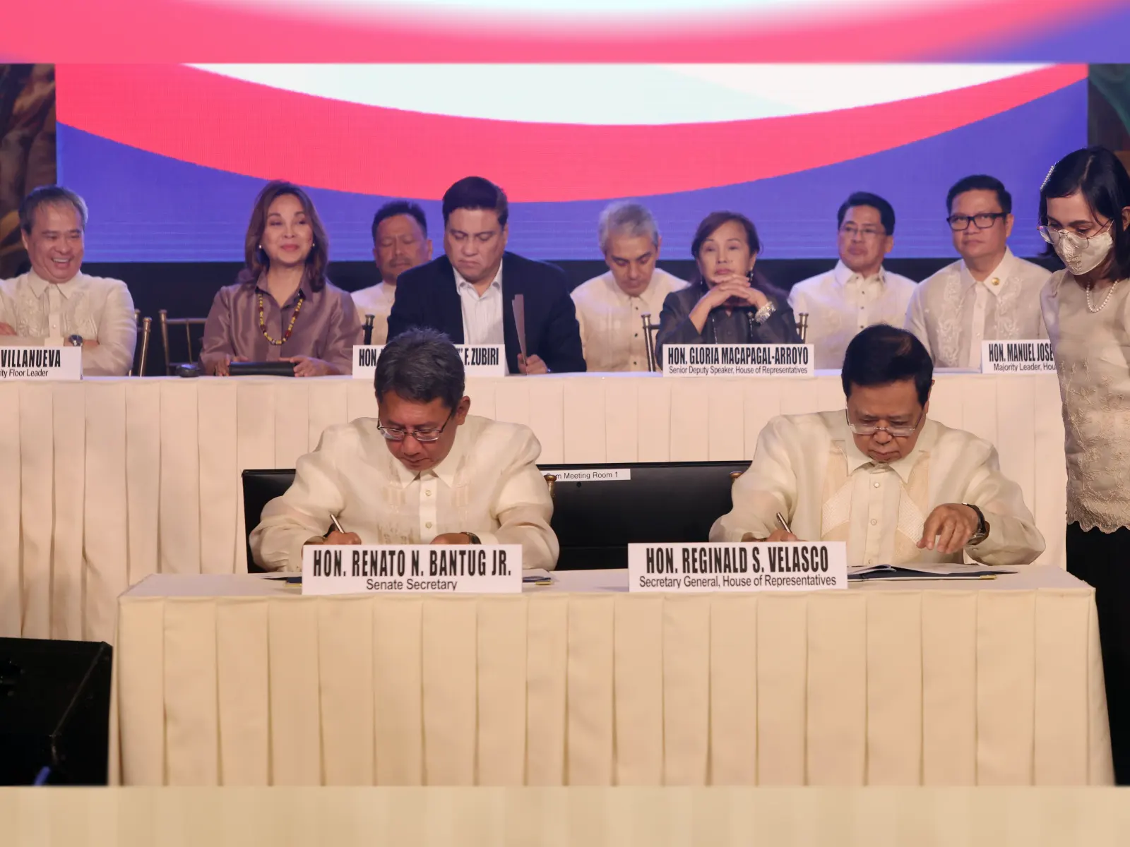 Senate Secretary General Renato Bantug Jr. and House Secretary General Reginald Velasco led the Ceremonial Signing of E-Congress at the old Senate building now the National Museum Thursday morning, also in photo are (from left) Senate Majority Leader Joel Villanueva, Senate Pro Tempore Loren Legarda, Senate Deputy Majority Leader JV Ejercito, Senate President Migz Zubiri, Navotas Rep. Toby Tiangco, Senior Deputy Speaker Gloria Macapagal-Arroyo, Agusan Del Norte Rep. Jose "Joboy" Aquino and House Majority Leader Manuel Jose "Mannix" Dalipe.