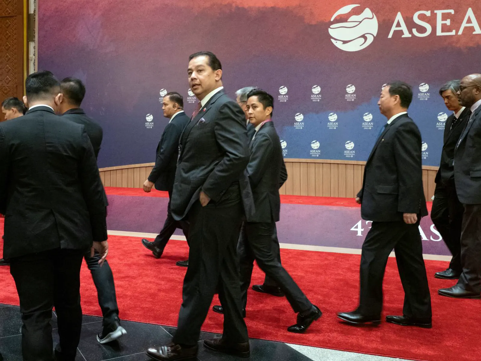 Speaker Ferdinand Martin G. Romualdez and House Senior Deputy Majority Leader Sandro Marcos walk with fellow delegates in the hallway of the Jakarta Convention Center (JCC) Tuesday.