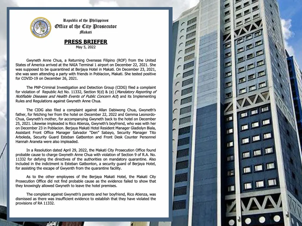 In a statement on Thursday, the prosecutor’s office said it found probable cause to charge Gwyneth Anne Chua of violating Republic Act 11332 or the “Mandatory Reporting of Notifiable Diseases and Health Events of Public Health Concern Act”.