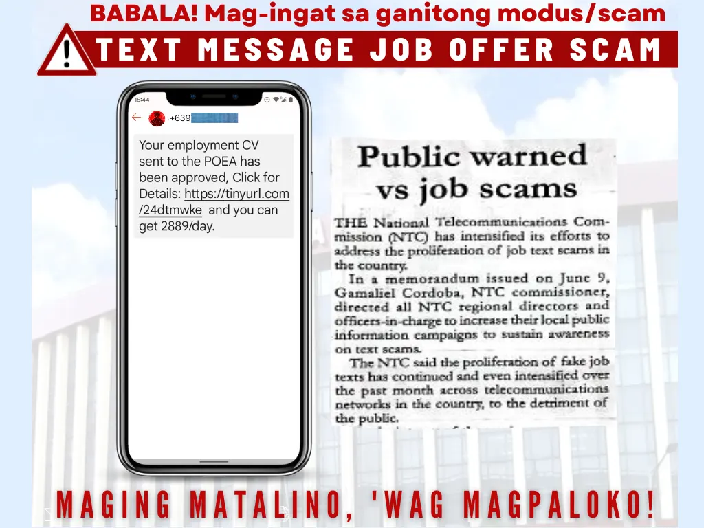 Citing a similar warning from the National Telecommunications Commission, the agency also urged the public not to be lured by text messages offering jobs with the promise of high salaries.