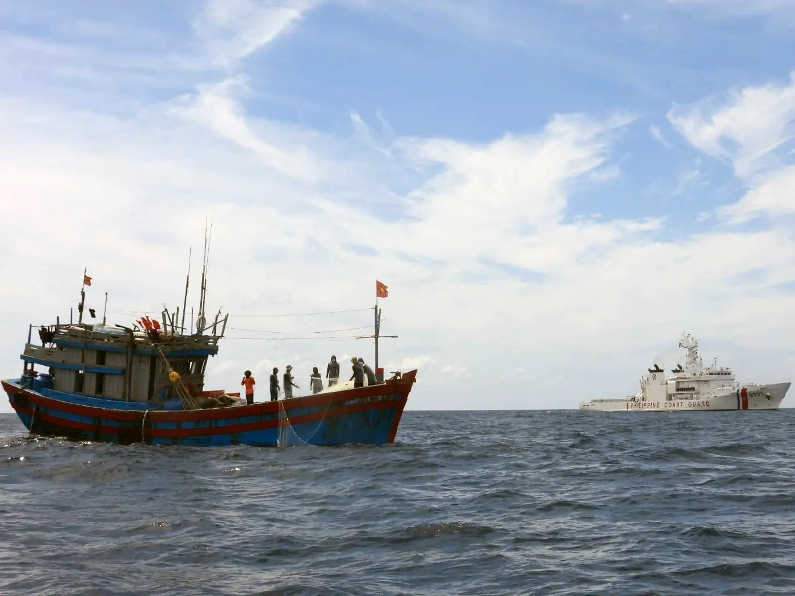 Over a week into its maritime patrol of the KIG and its surrounds, MRRV-9701 encountered a Vietnamese-flagged fishing vessel in the waters off Recto Bank (Reed Bank) engaged in long-line fishing operations.