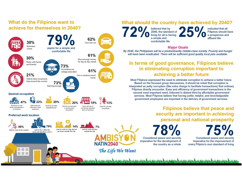 Ang AmBisyon 2040 represents the collective long-term vision and aspirations of the Filipino people for themselves and for the country in the next 25 years. This development plan was outlined by the Economic Development Authority (NEDA) and must be carried out by four successive administrations of the country.