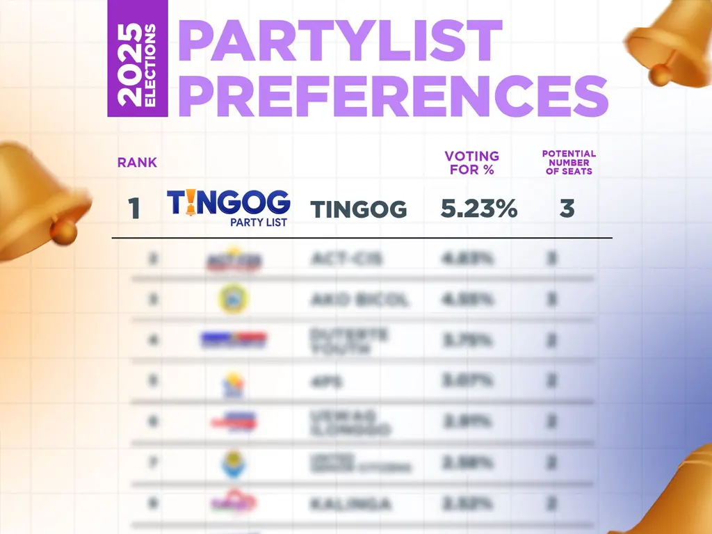According to the survey, TINGOG received 5.23% of voter preference nationwide—placing it first among all party-list organizations and securing a projected three seats in the House of Representatives.