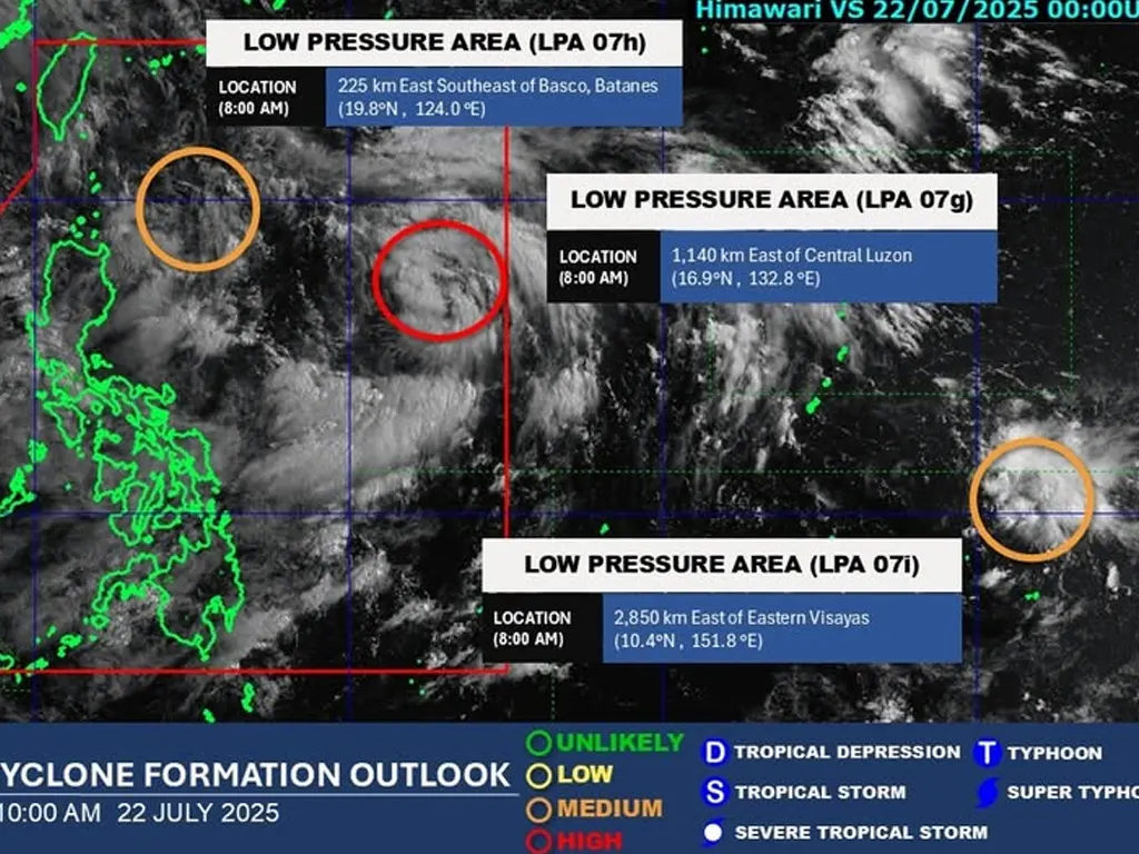 Two of these weather systems are currently within the Philippine Area of Responsibility (PAR), while a third LPA remains outside. Pagasa has warned of a significant chance that the two LPAs inside PAR will develop into tropical cyclones in the coming days, with the possibility of the two systems merging.